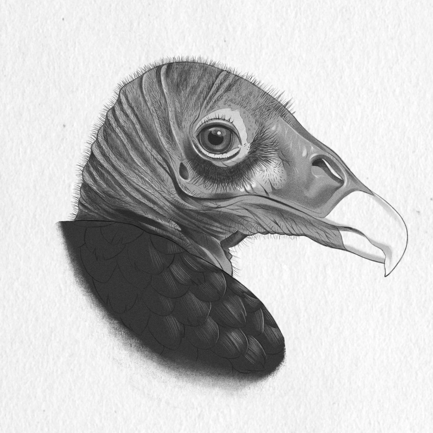 Black and white drawing of a turkey vulture head and neck with detailed feathers and facial features. View fullsize