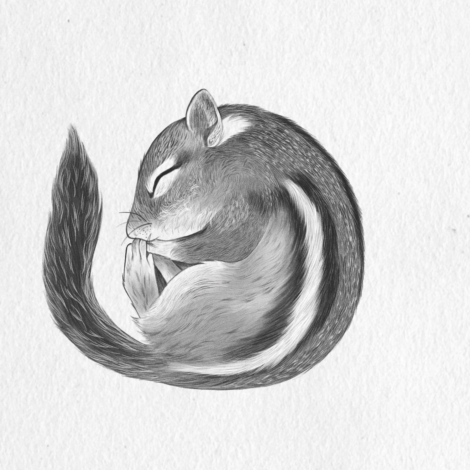 Black and white illustration of a curled-up sleeping chipmunk with detailed fur and closed eyes.
