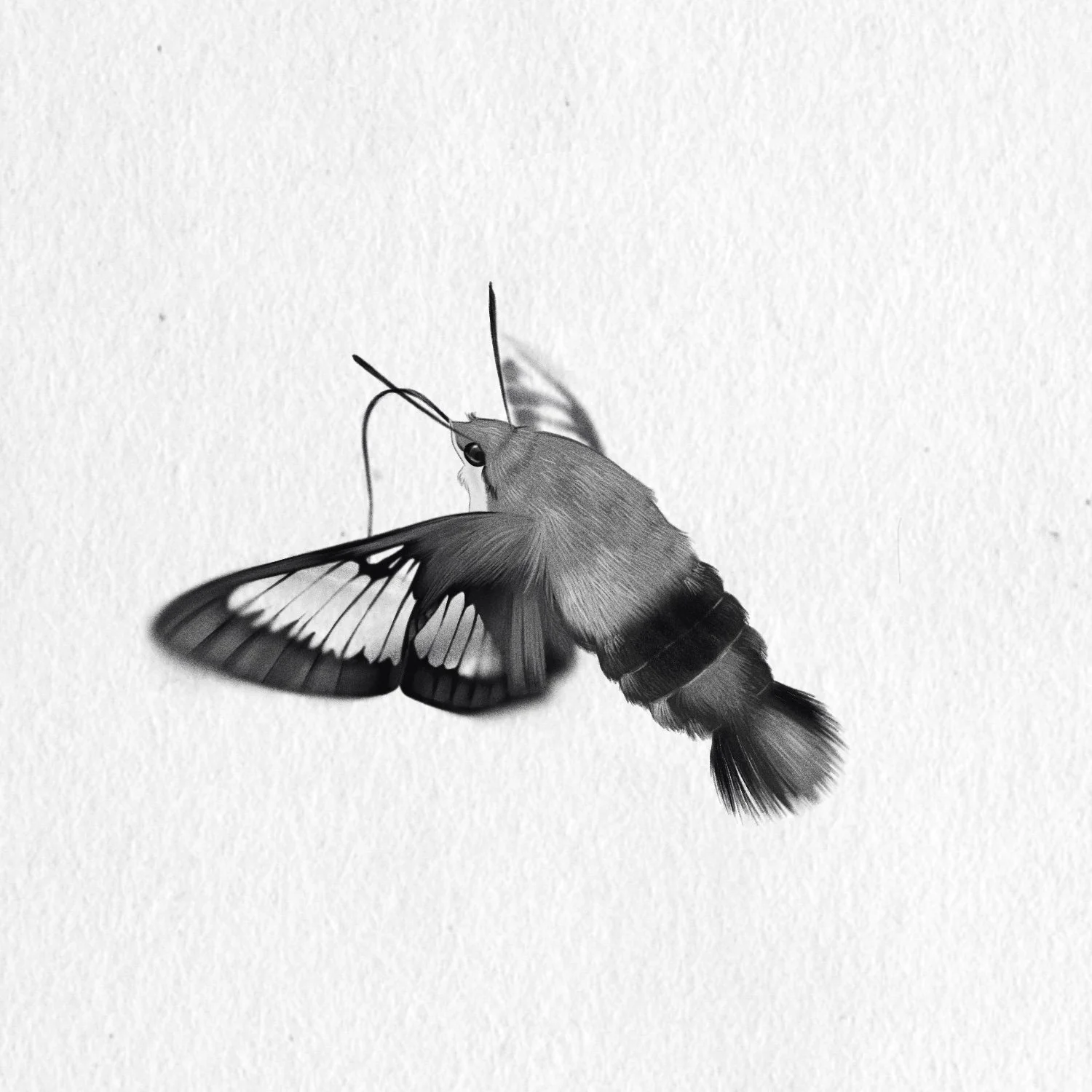 Black and white photo of a hummingbird moth hovering near a flower View fullsize