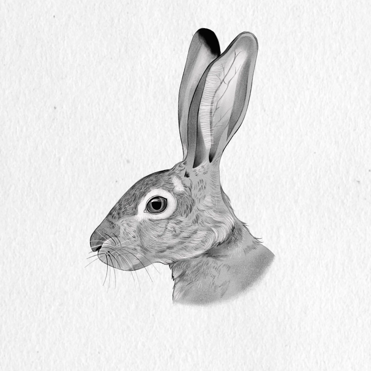 Black and white drawing of a rabbit with a detailed profile view. View fullsize