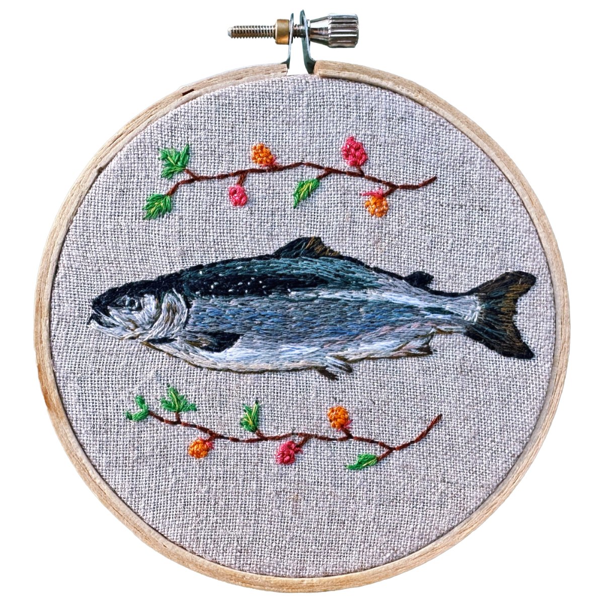 Embroidery of a fish on a fabric background, surrounded by embroidered branches with colorful berries and green leaves, in a circular wooden hoop.