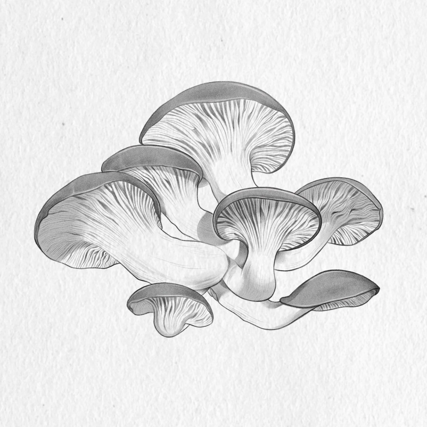 Black and white illustration of a cluster of wild mushrooms with detailed gills and curved caps.