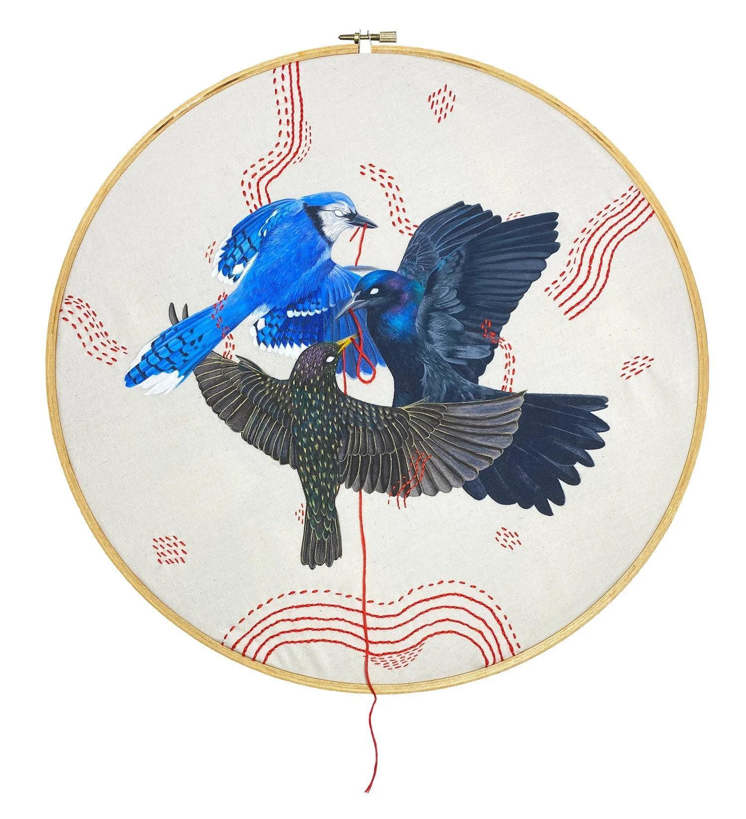 Artwork of three birds, two black and one blue, with red embroidered lines and shapes surrounding them, within a circular embroidery hoop.