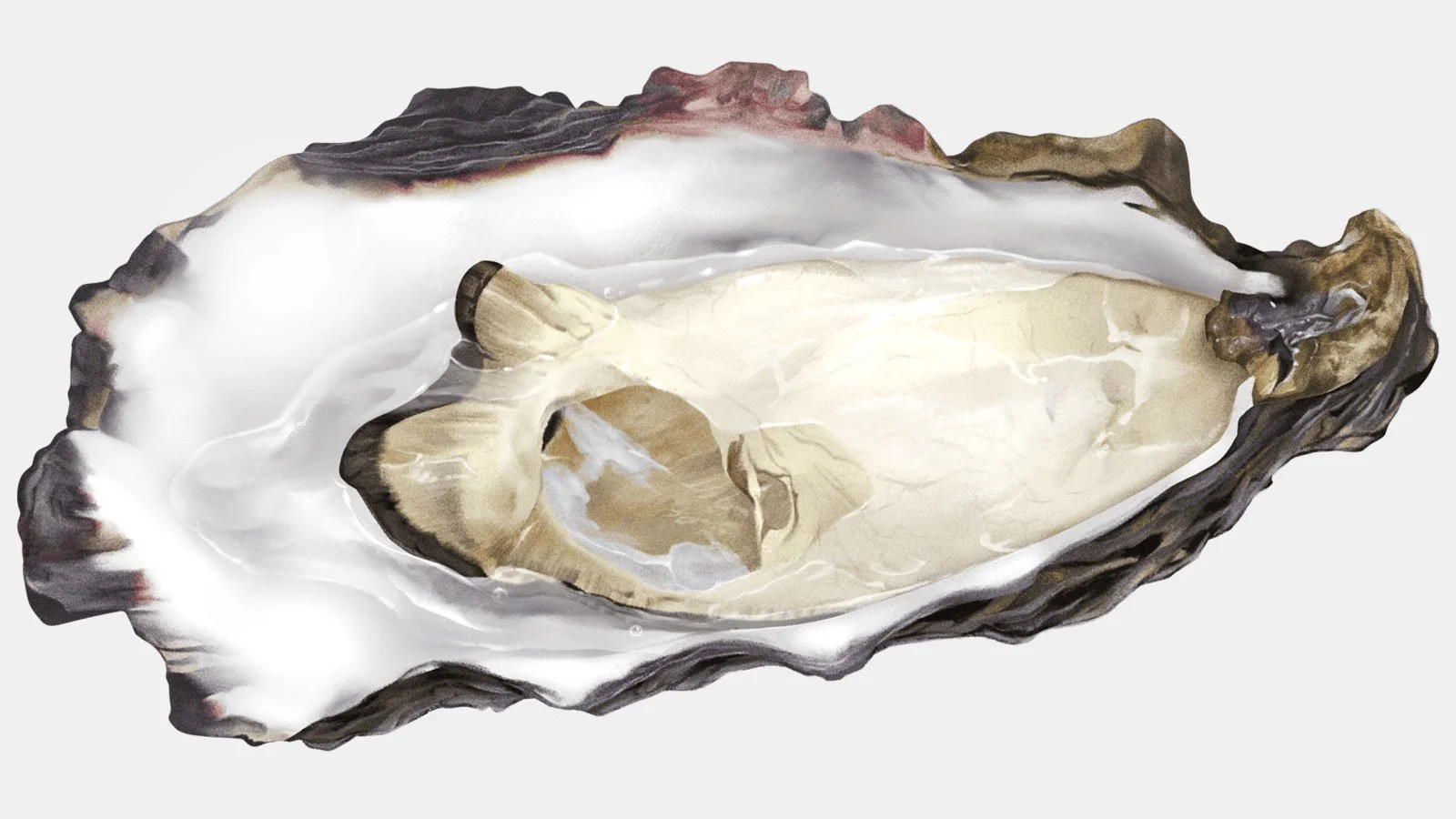 Open oyster shell with the oyster inside, showing its textured meat in the shell. View fullsize