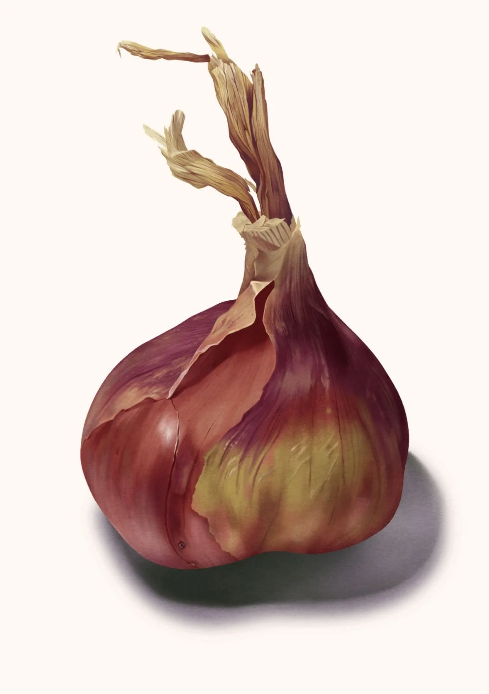 A large onion with cracked and peeling outer layers, showing its brownish skin and dried, papery top. View fullsize