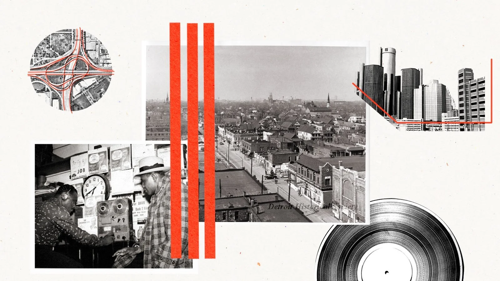 Black and white collage featuring cityscapes, a black and white photo of two people in a record store, diagrammatic illustrations with red lines, and a record turning on a turntable. View fullsize