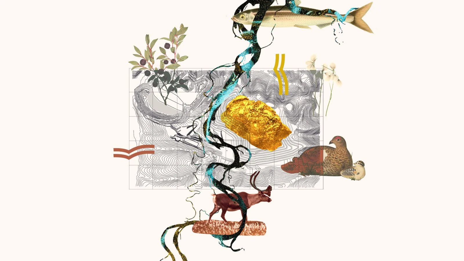 An artistic collage featuring a fish, bird, dog, and plant with abstract elements and topographic lines.