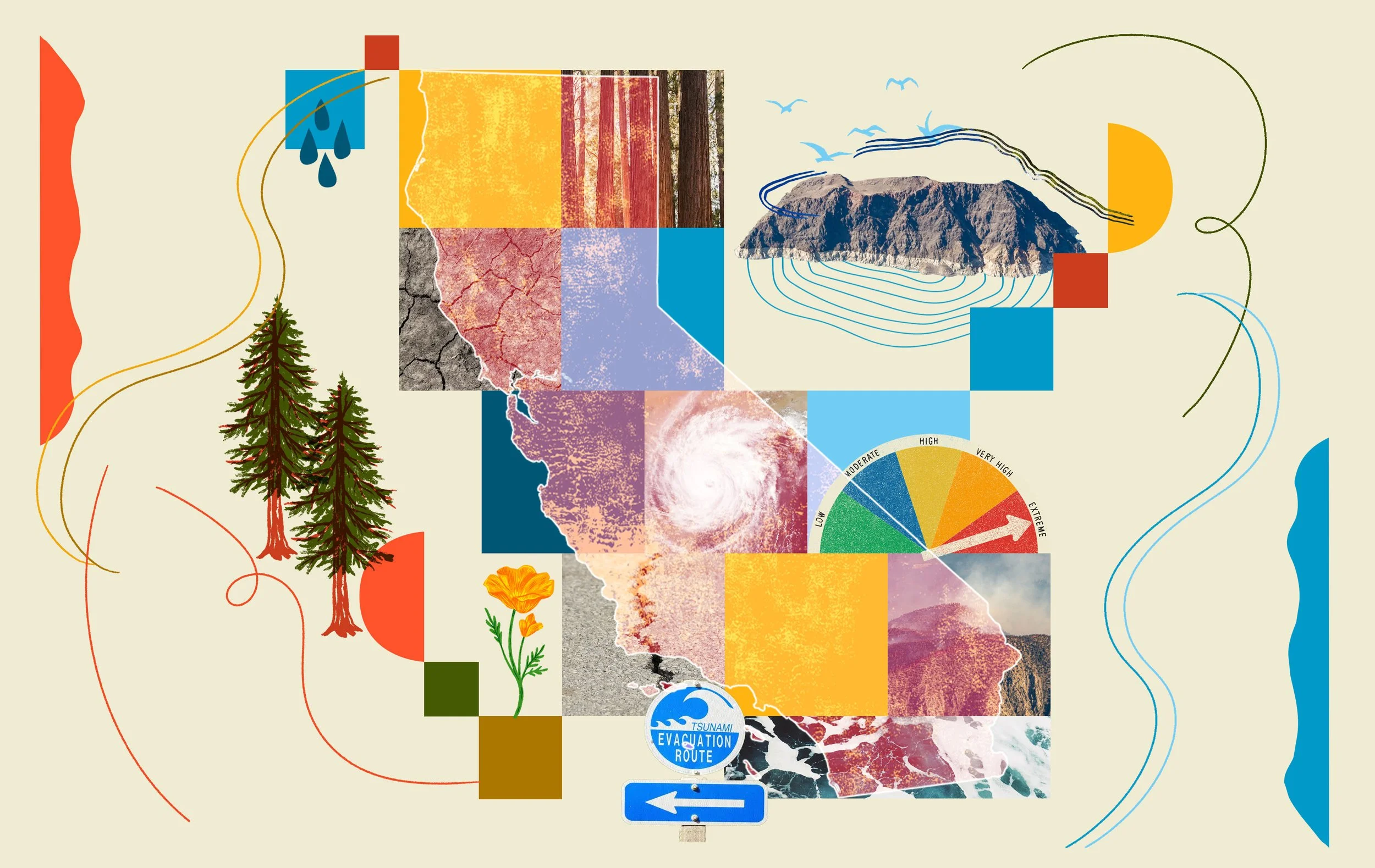 Collage of climate and natural hazard symbols, including a hurricane, tsunami evacuation sign, trees, a mountain, an earthquake map, a weather radar, a drought, and drought severity gauge, with abstract lines and blocks of color.