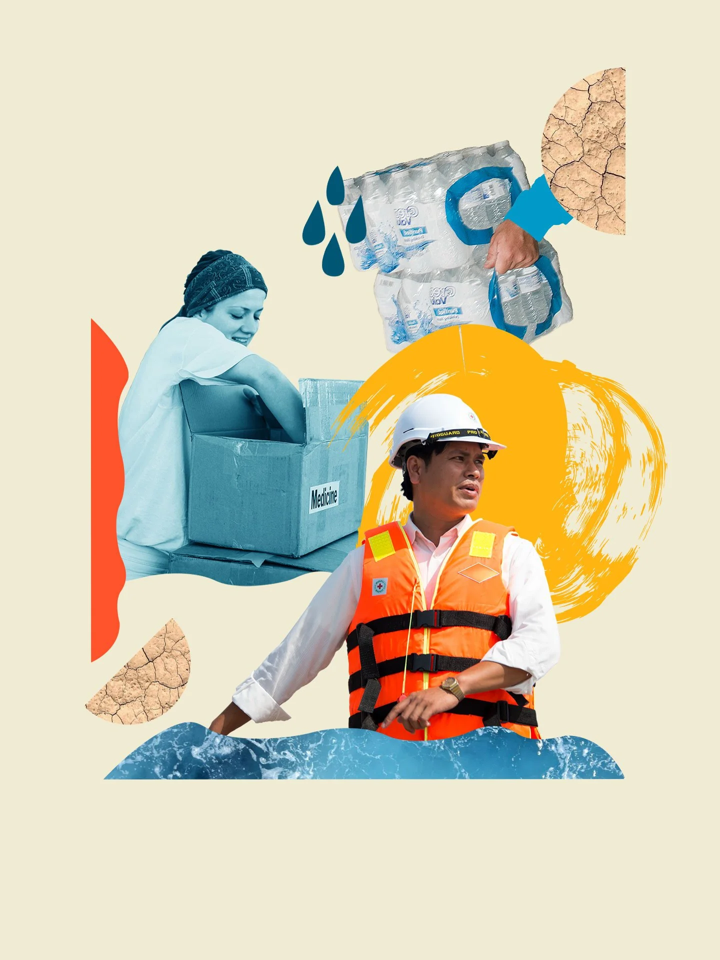 Collage featuring a woman with a headscarf reaching into a box labeled 'Medicine,' a man wearing a white helmet and orange life vest standing by water, a hand holding a pack of bottled water, and textured background elements including cracked earth a