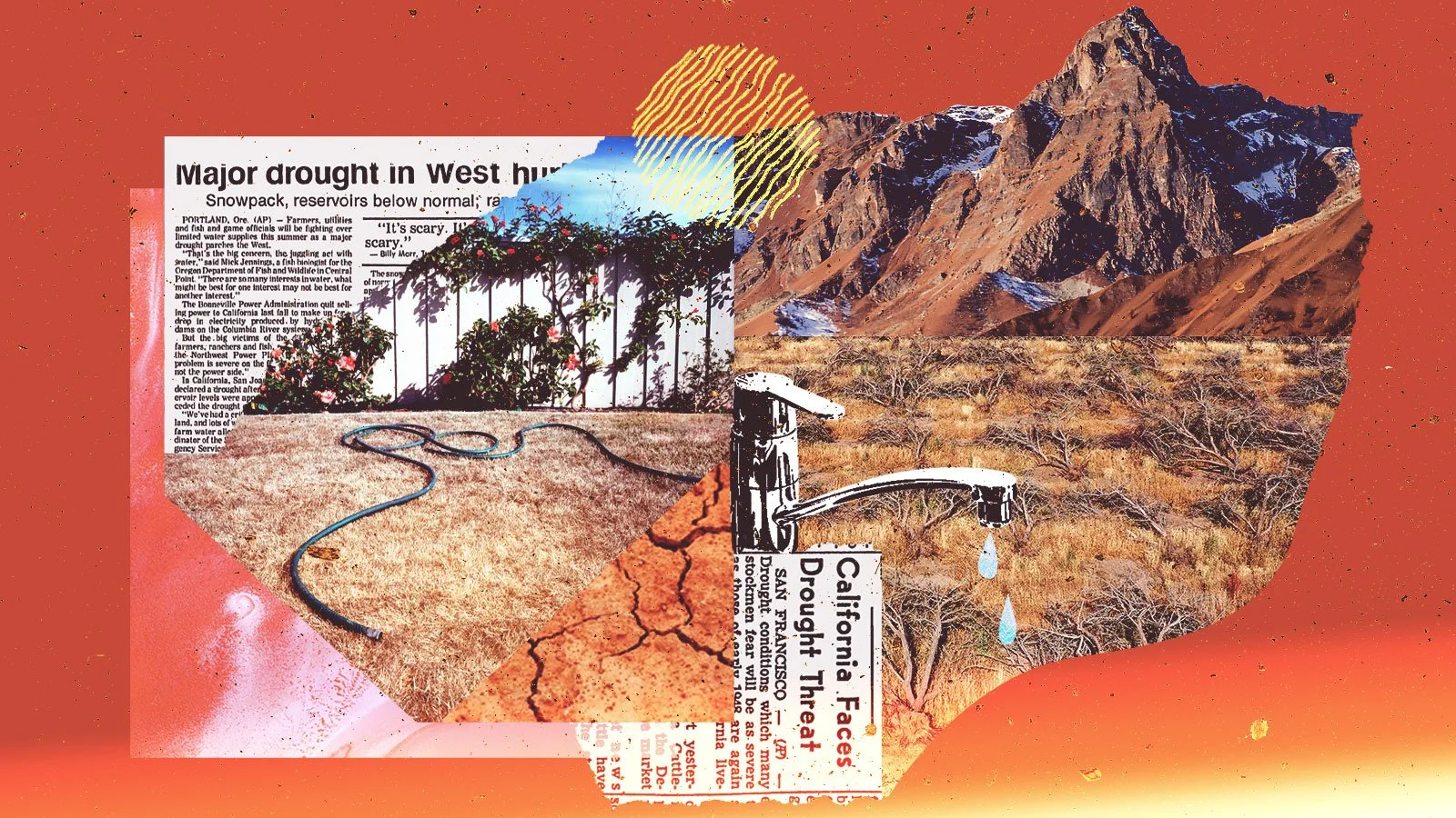 Collage of environmental themes including a drought news headline, a garden with a hose, a mountain landscape, and a dripping faucet, combining newspaper clippings and landscape imagery.