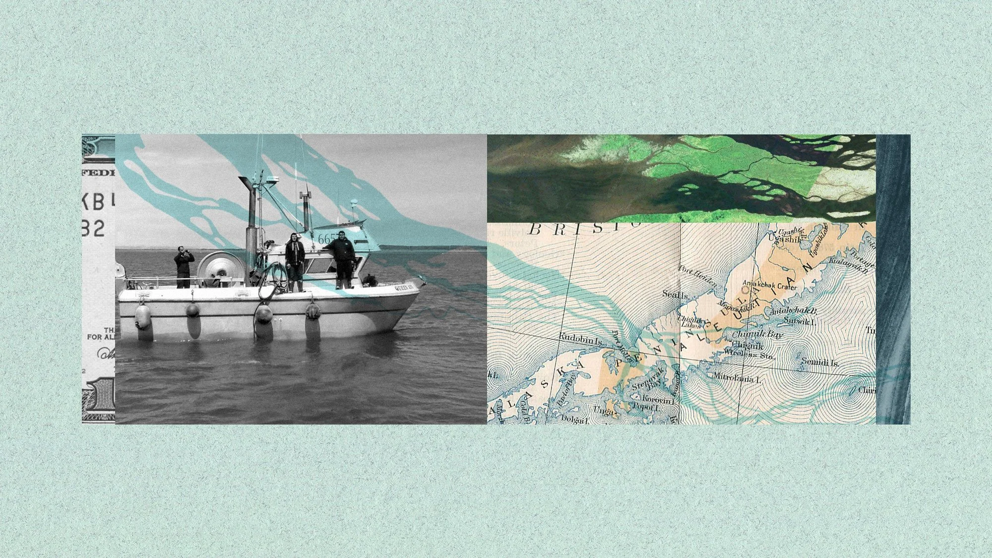 Collage of a NOAA research ship, a map of the Alaska coast, and a painting of a tree with green leaves. View fullsize