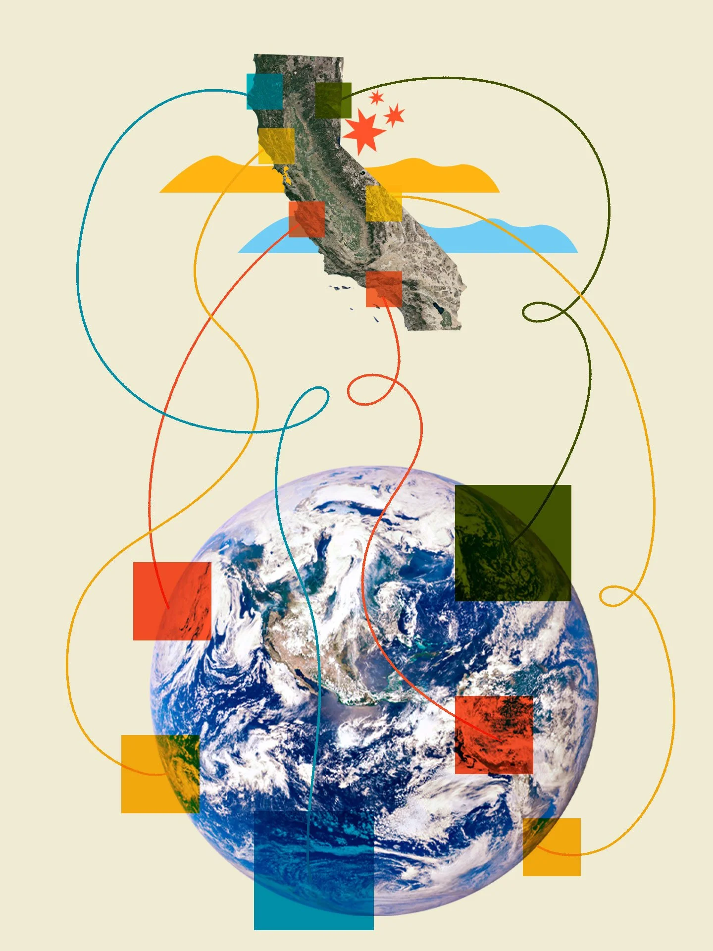 An abstract infographic showing the state of California overlaid on a satellite image of Earth, connected by colorful lines and squares representing various environmental or geographic elements.