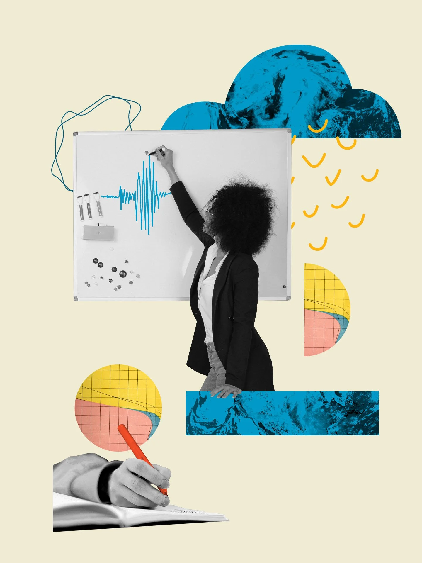 A woman drawing a blue sound wave on a whiteboard, with abstract colorful geometric shapes and cloud illustrations in the background. View fullsize