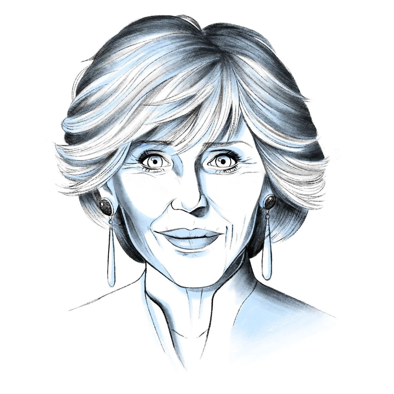 A black and white digital illustration of an older woman with short, wavy hair, wearing earrings and smiling.