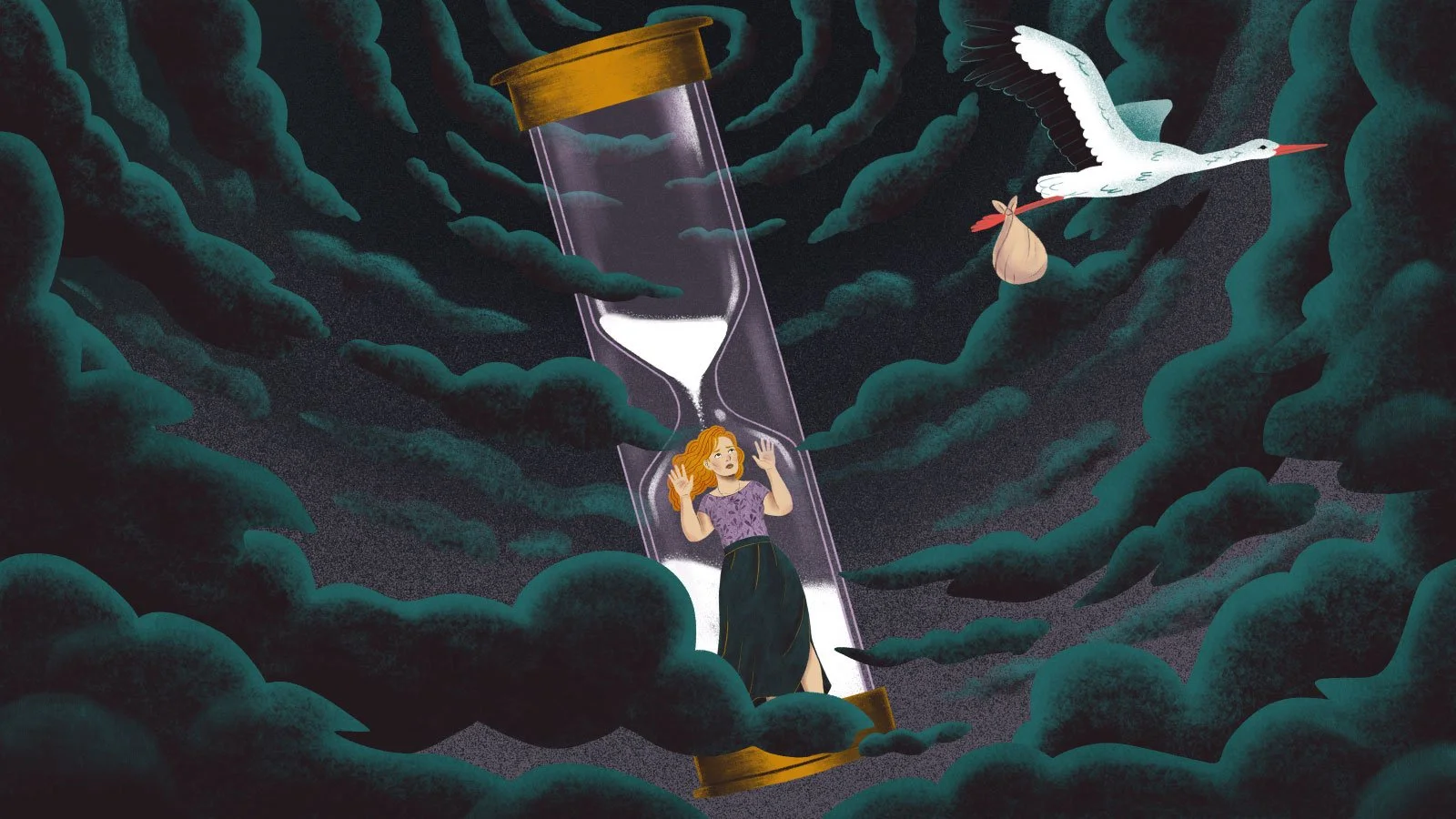 A girl with red hair inside an hourglass surrounded by dark clouds. A stork carrying a cloth bundle flies nearby.