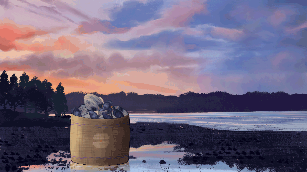 A digital painting of a sunset over a lake with purple and pink clouds, dark shoreline, and a bag of mussels in the foreground.