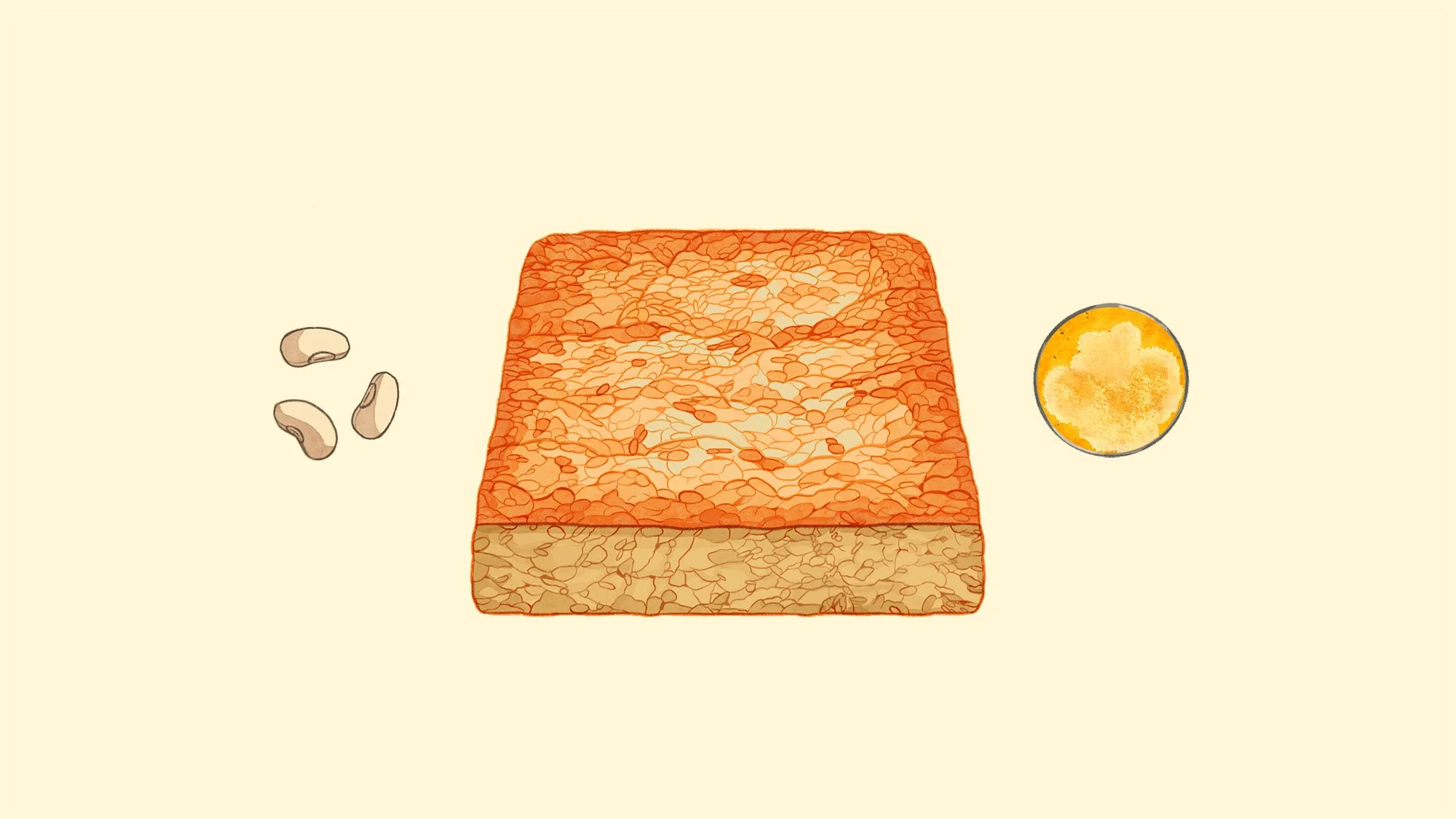 Illustration of an orange square-shaped soy cake with a textured surface, three beans on the left, and a petri dish with yellow substance on the right.