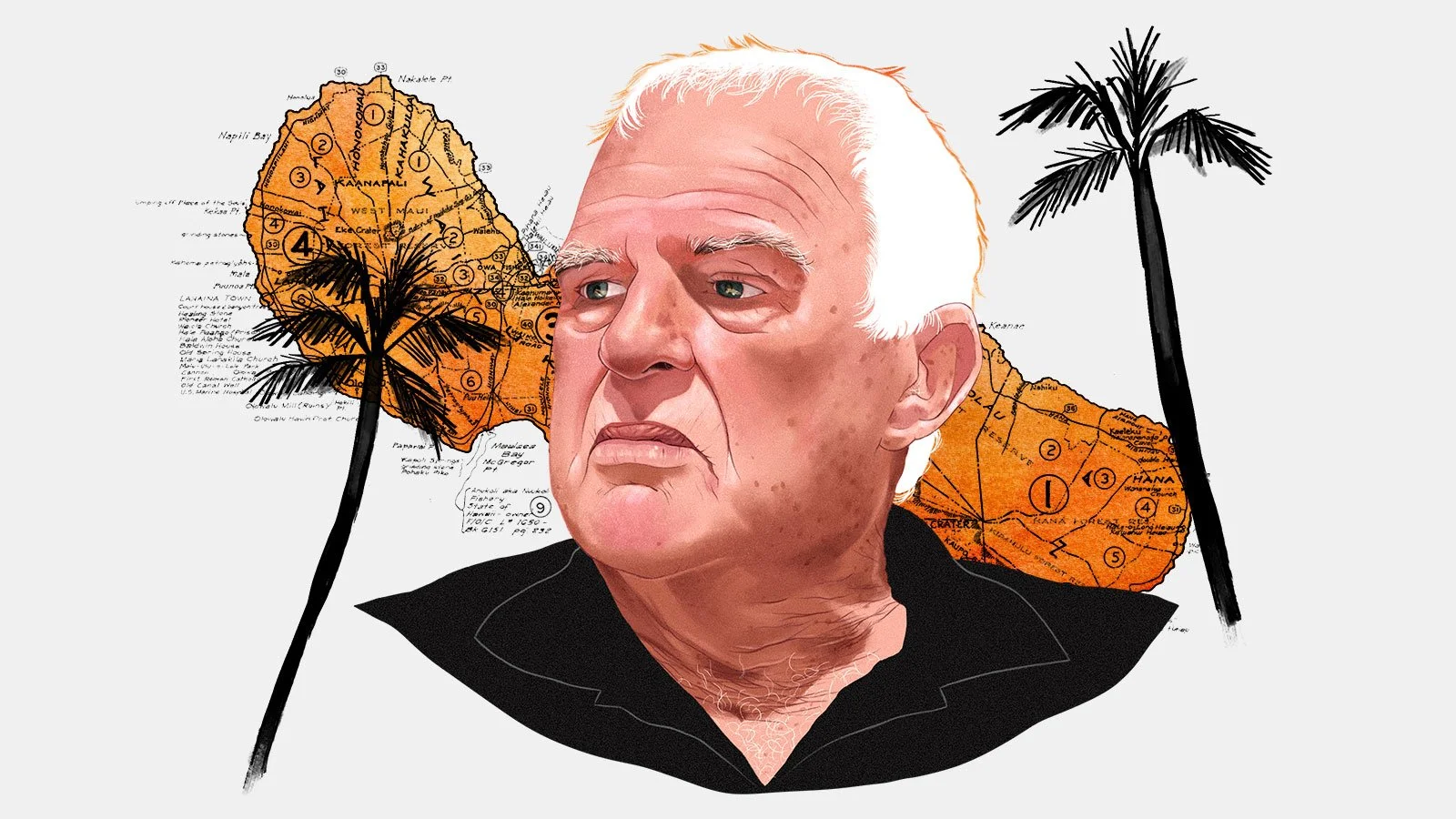 Illustration of an elderly man with white hair, set against a background featuring two orange-colored map sections of Hawaii and two black palm trees. View fullsize