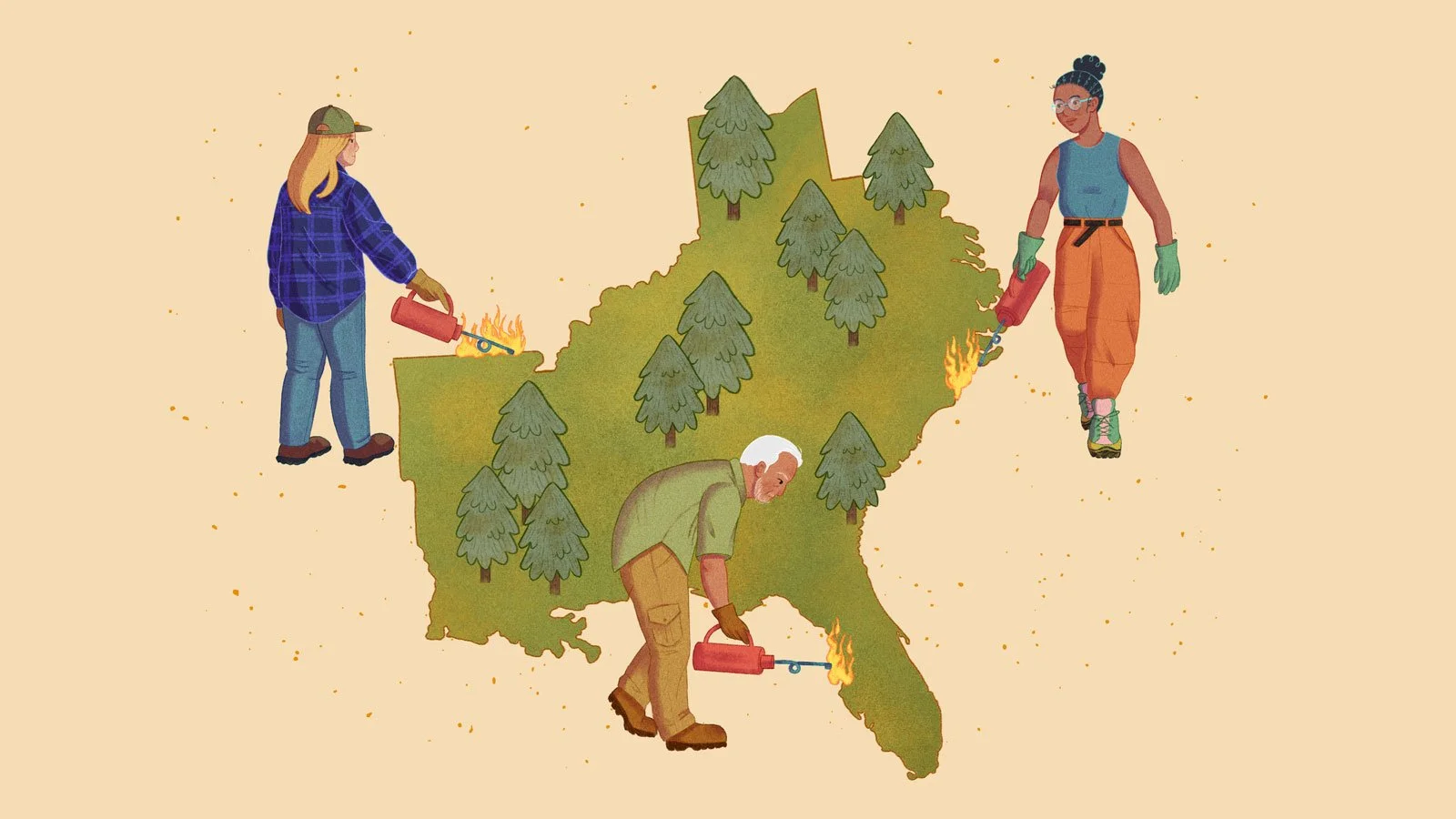 Illustration of three people burning parts of the map of the United States, symbolizing forest fires.